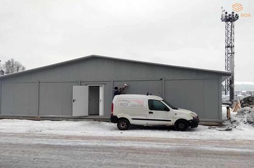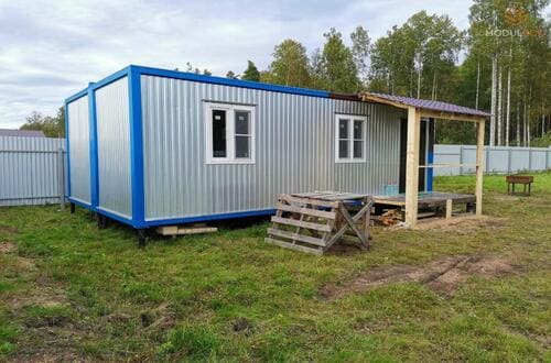 Собрано на основе двух объединённых блок-контейнеров типа БК-01 и БК-02. За счёт этого данный модульный дом имеет внутренний тамбур минимального размера, организованный перед входной дверью сооружения. В остальном конструкция соответствует планировке использованных для него контейнеров - имеет одну входную дверь и три ПВХ-окна, расположенных с торцовых сторон здания.